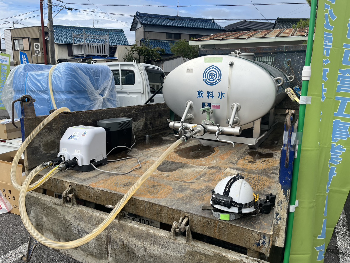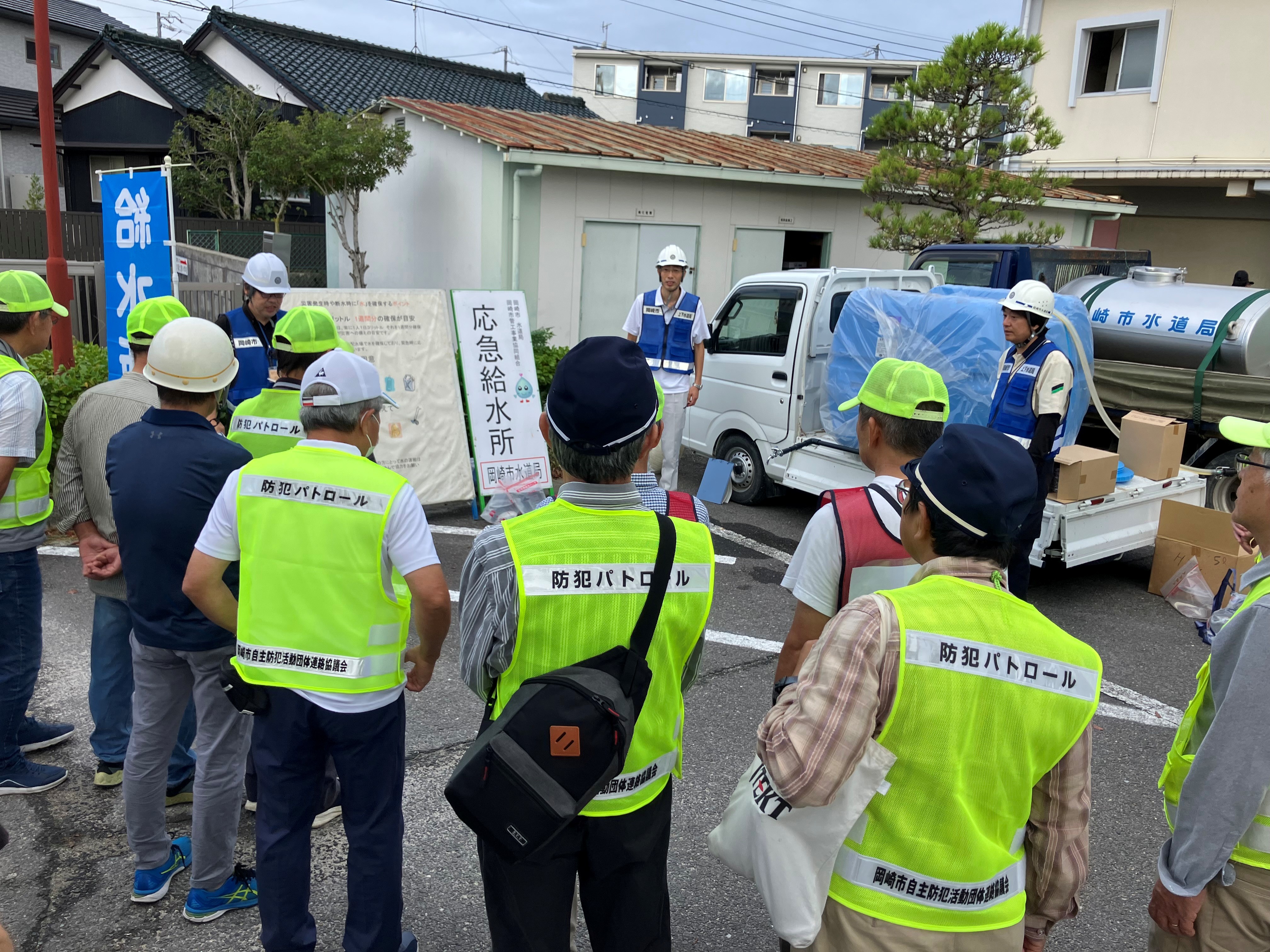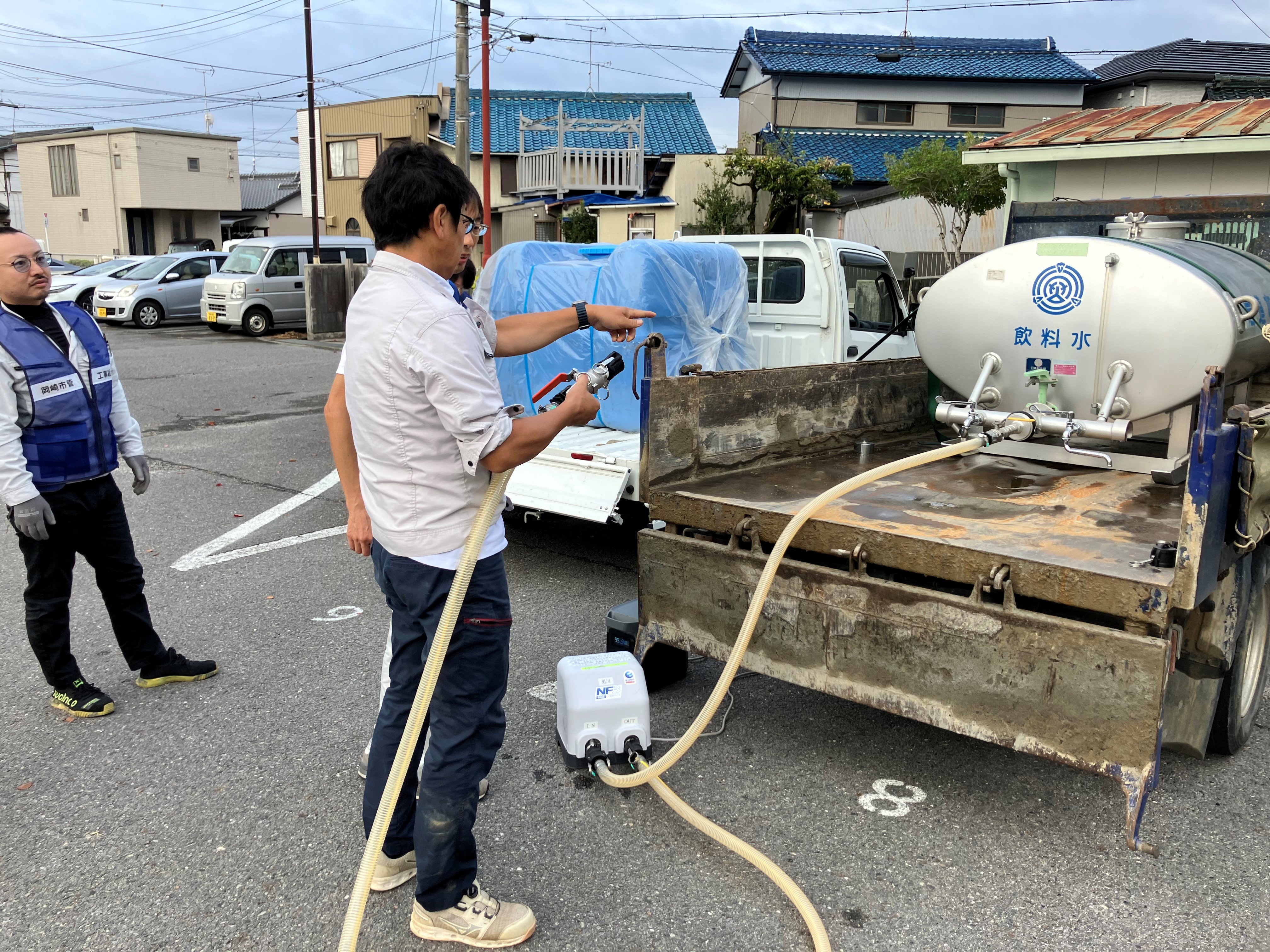 | 令和7年10月5日(日)に六ツ美北部小学校にて岡崎市地域総合防災訓練を上下水道局様と合同で行いました。訓練は、ダンプで大西配水場へ行き、給水タンクを積載後、給水。その後、訓練会場である六ツ美北部小学校へ移動。バッテリー、ポンプを用いて現地の給水タンクへ水を移し替えるというものでした。事前にシミュレーションを行っていたこともあり、スムーズに給水作業ができました。 |