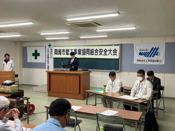 岡崎労働基準監督署署長様、岡崎市上下水道局上下水道部水道工事課1係係長様を講師にお招きし、「工事事故及び苦情等について」「危なさと向き合おう」の安全講話を受けました。 |